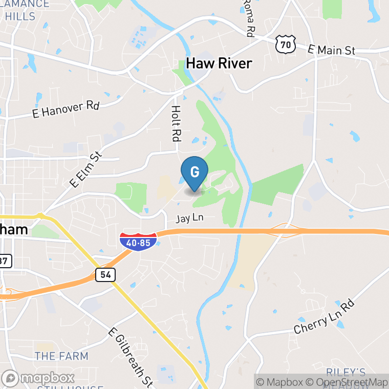 This rolling course is carved out of North Carolina farmland and is very wooded. Water comes into play on nine holes. Locals say that the layout gets more difficult with each hole, and the round culminates with a challenging hole on #18, a 567-yard, par 5. The fairway doglegs to the left and you must lay up between a creek on the left side, or chance cutting to the corner to reach the green in two. The green is protected by a creek and rock formations that lie in front.